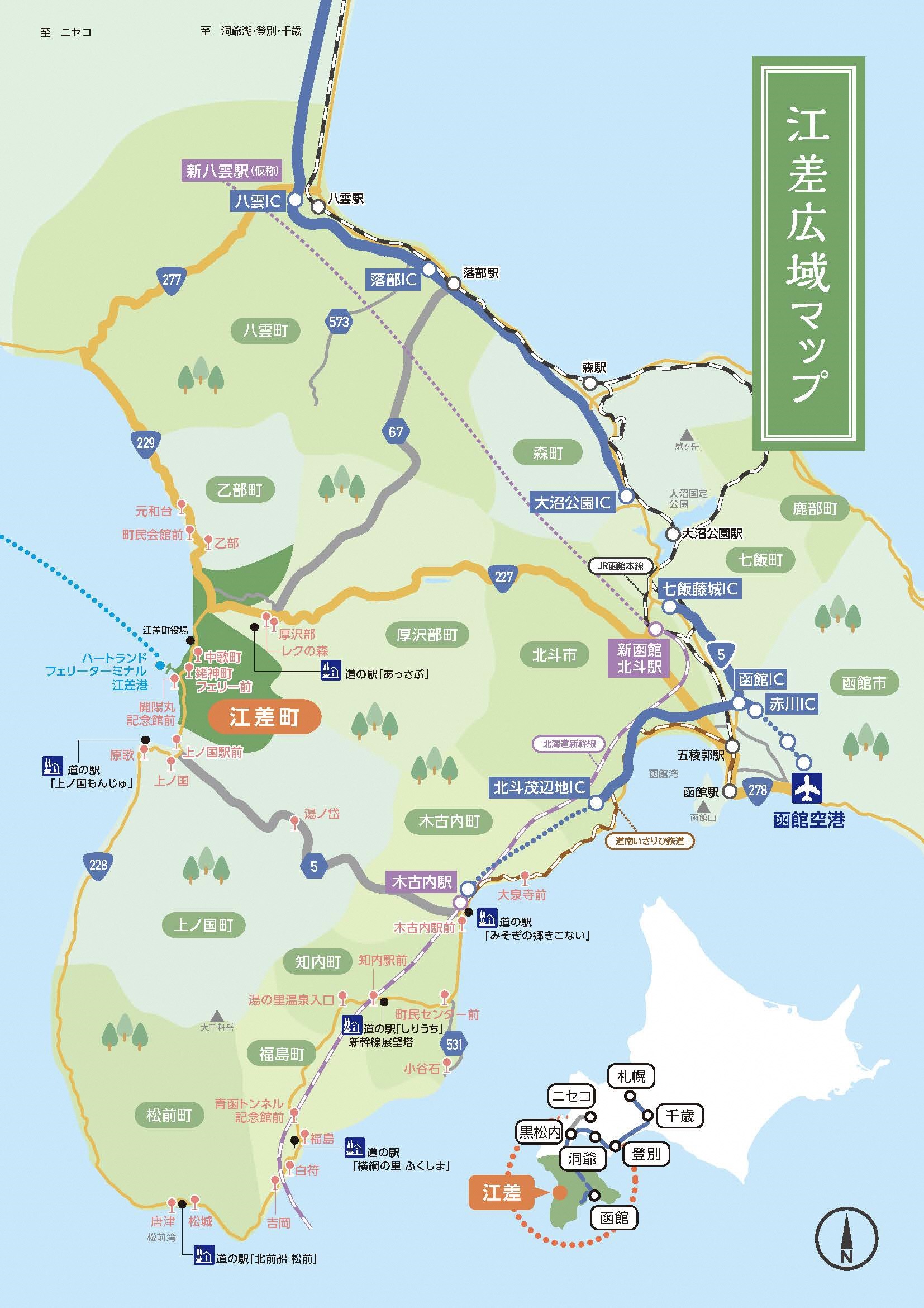 | 新函館北斗駅 | 約1時間 | 56㎞ | 北斗-厚沢部-江差 |