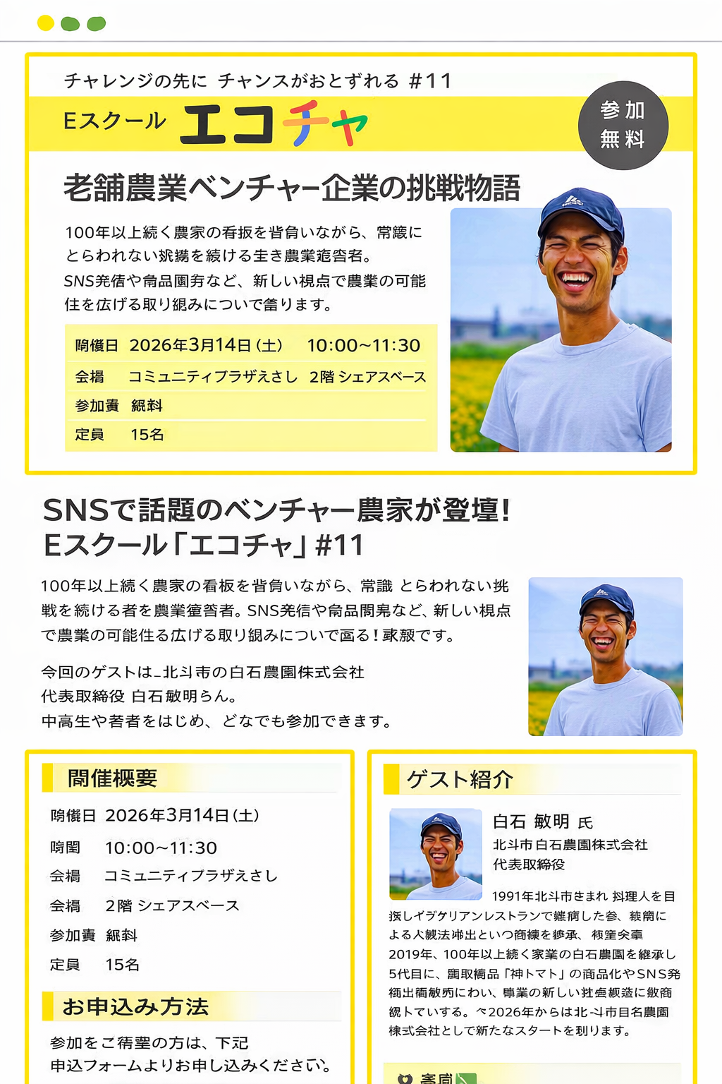 1991年北斗市生まれ。料理人を目指しイタリアンレストランで修行後、難病による大腸全摘出の試練を経験。2019年、100年以上続く家業の白石農園を継承。5代目として看板商品「神トマト」の商品化やSNS発信を積極的に行い、農業の新しい価値創造に取り組んでいる。