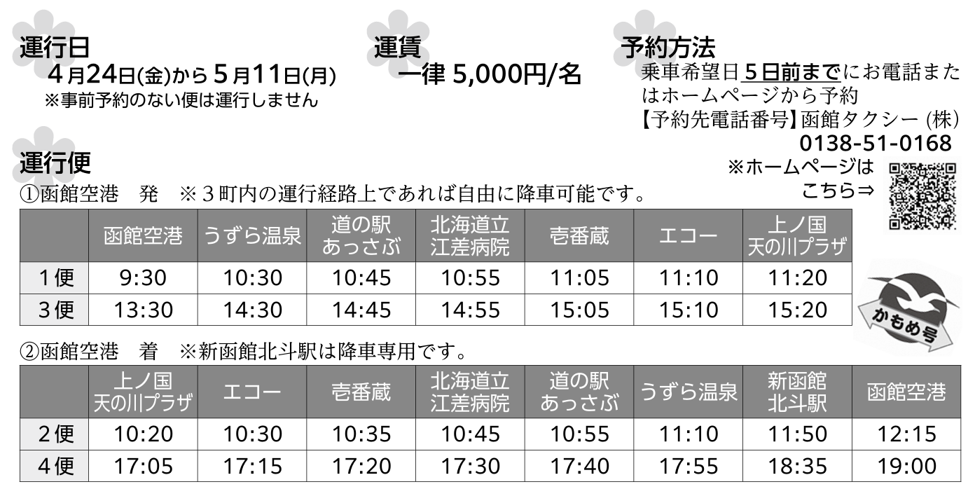 函館空港と檜山3町(江差町・上ノ国町・厚沢部町)を結ぶ乗合タクシー【かもめ号】が今年度も運行しま
