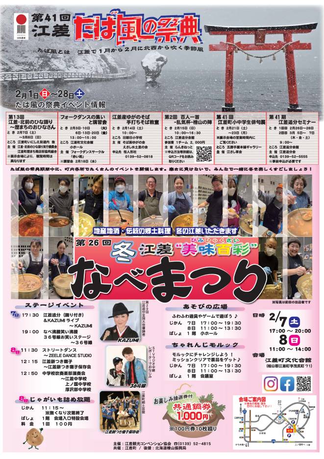 | 第26回 江差“美味百彩”なべまつり | 日 時:2月7日(土)17時から20時 8日(日)11時から14時 場 所:江差町文化会館 主 催:江差観光コンベンション協会 |
