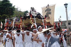 → Leading the procession of Mikoshi (portable shrines).