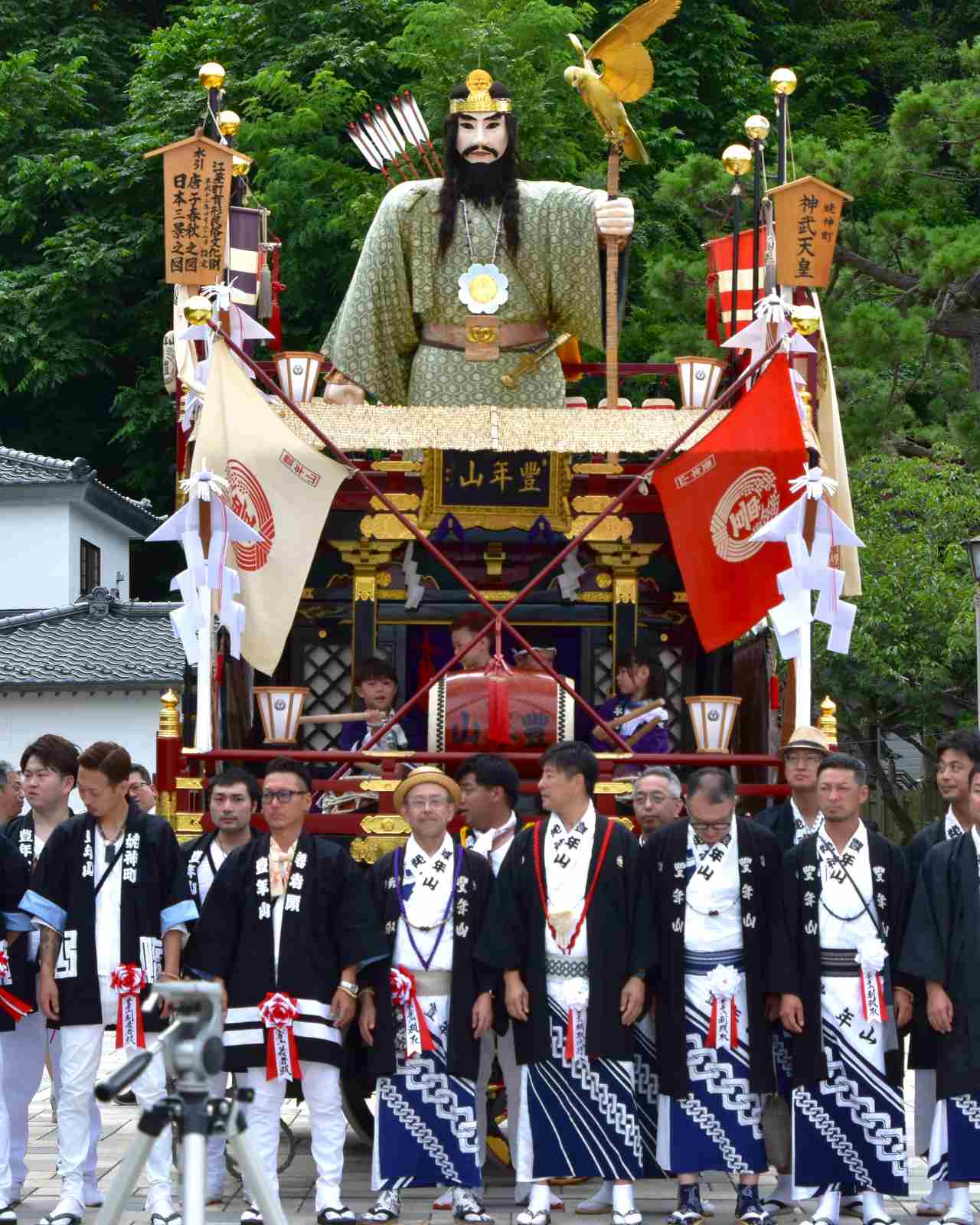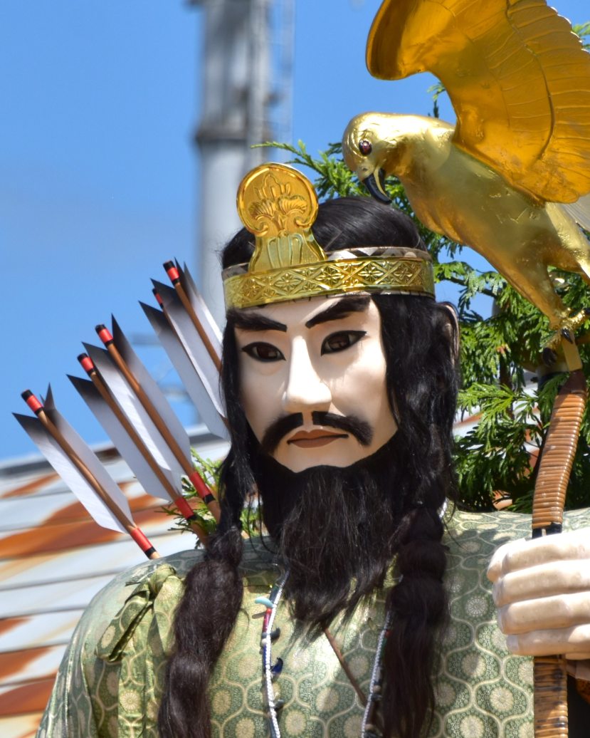 神日本磐余彦尊は、はるばる瀬戸内海を渡り河内から大和へ進撃するが、兄五瀬命は戦傷で薨去、八咫鳥の先導で吉野に入り、大和を平定橿原の宮に即位する。宿敵長髄彦との戦いで天候が急変し、金鵄が来りて天皇の弓に止まり、天神の威光に賊軍は目眩みて潰滅したと東征神話にある。昭和55年人形司 12世伊東久重の作で、伊東司は享保年間京都四条高倉で桝谷庄五郎名で人形づくりを家業とするが、後桜町天皇より「有職御人形司伊東久重」の名を賜り代々継承する。後に光格天皇より「入魂の作に押す」拾六菊花紋印を賜る。