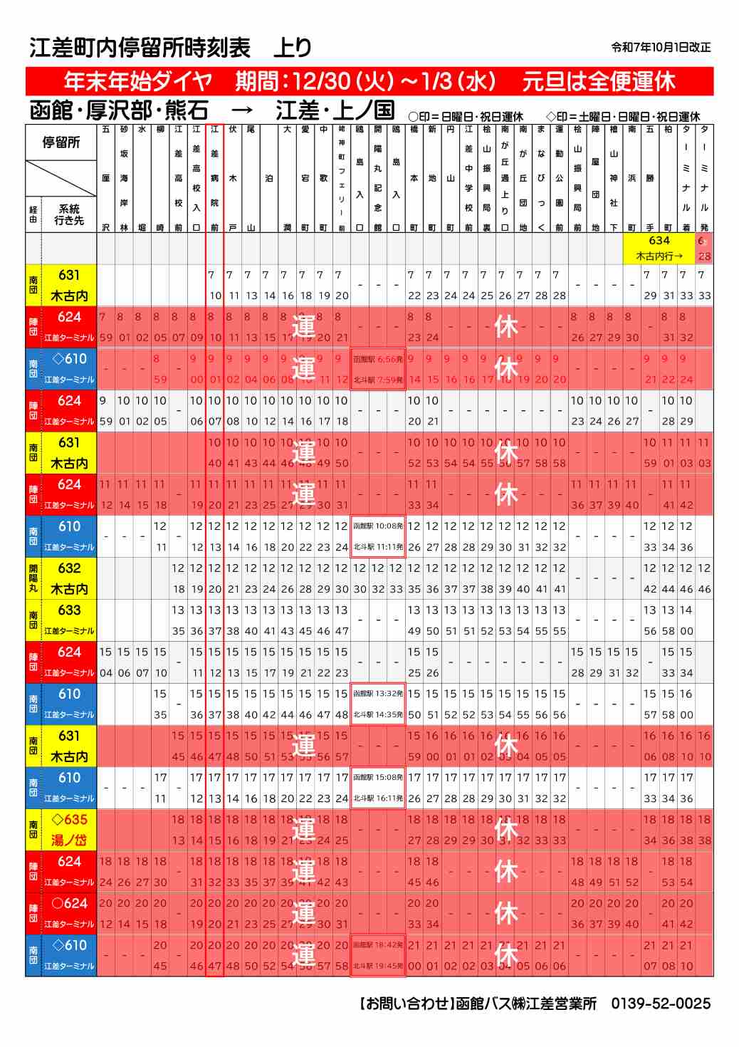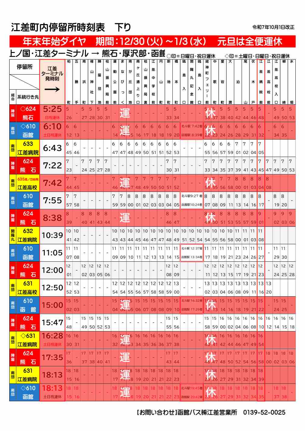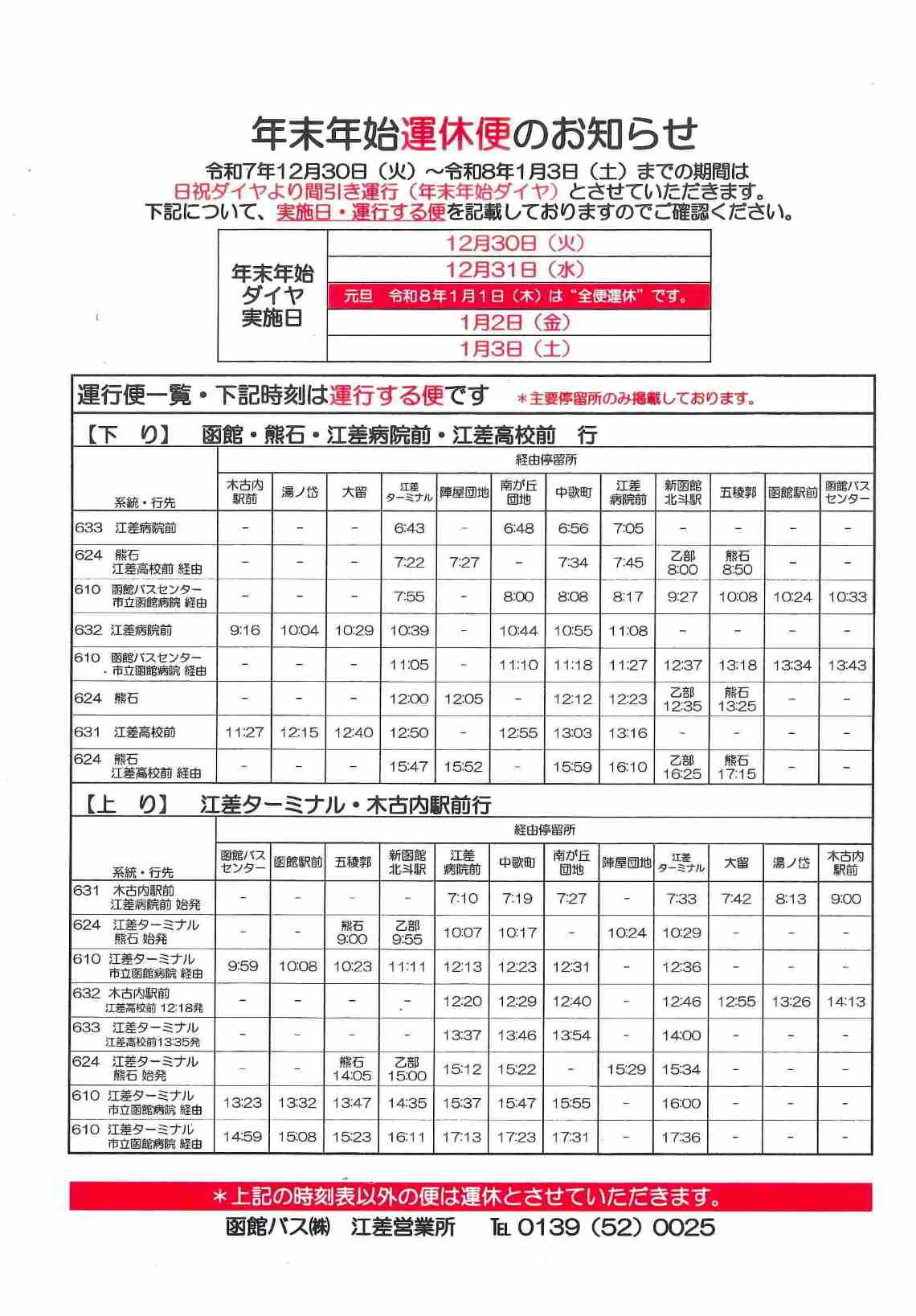 函館バス 年末年始運休便のお知らせ 2025年12月22日更新 ダウンロードはこちらから 年末年始の特別ダイヤ 年末年始ダイヤ(上り)ダウンロードはこちら 年末年始ダイヤ(下り)ダウンロードはこちら 【お問い合わせ】 函館バス(株)江差営業所 ☎ 0139-52-0025