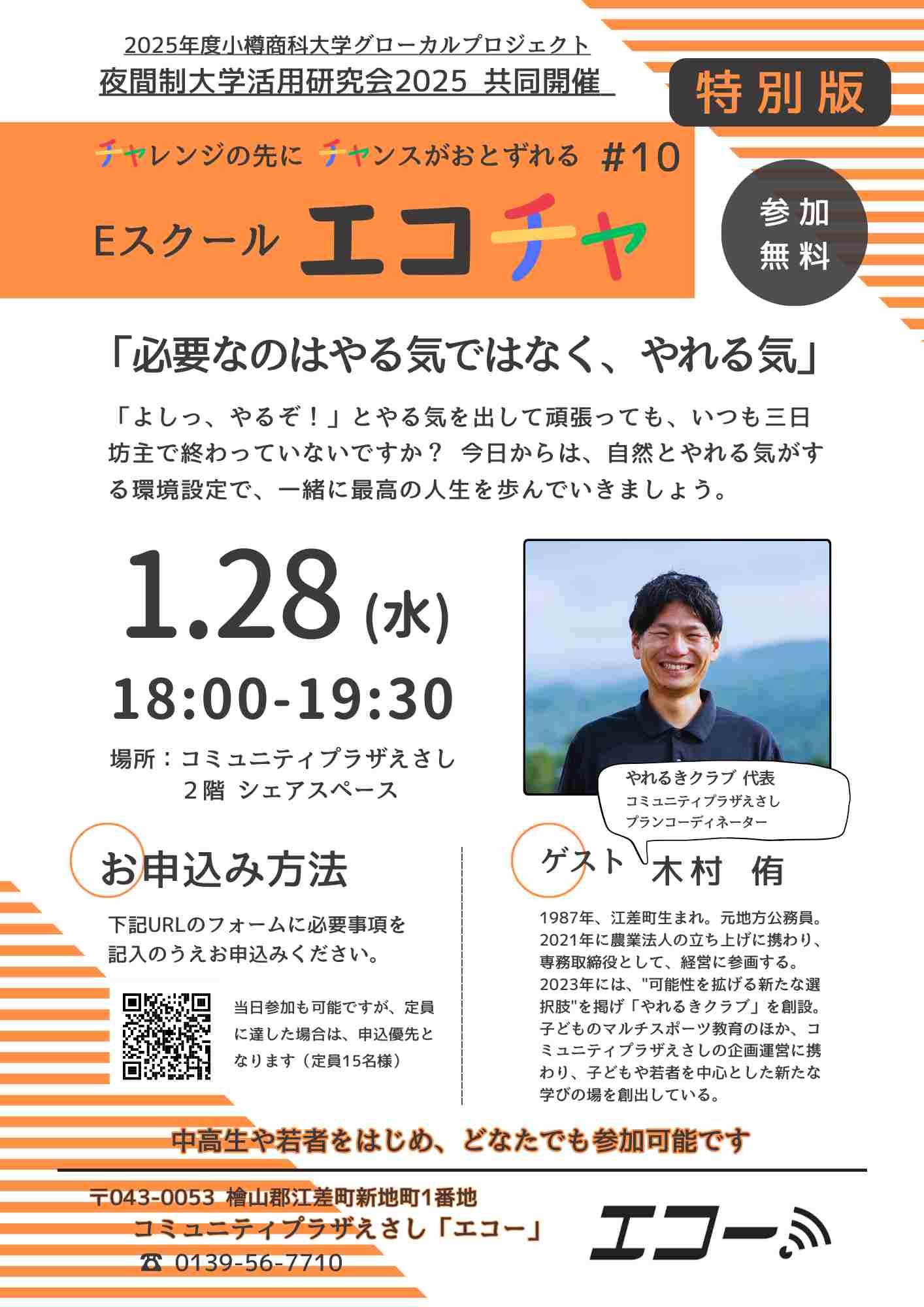 コミュニティプラザえさしエコチャ#10を開催します! 2026年01月07日更新 イベント概要 開催日 令和8年1月28日(水) 開催時間 18時00分~19時30分 開催場所 コミュニティプラザえさし 2階 シェアスペース 講師 木村 侑 参加料 無料 お申し込み方法 下記QRコードから応募フォームに必要事項を記入のうえお申し込みください。 QRコードはこちら アクセスマップ