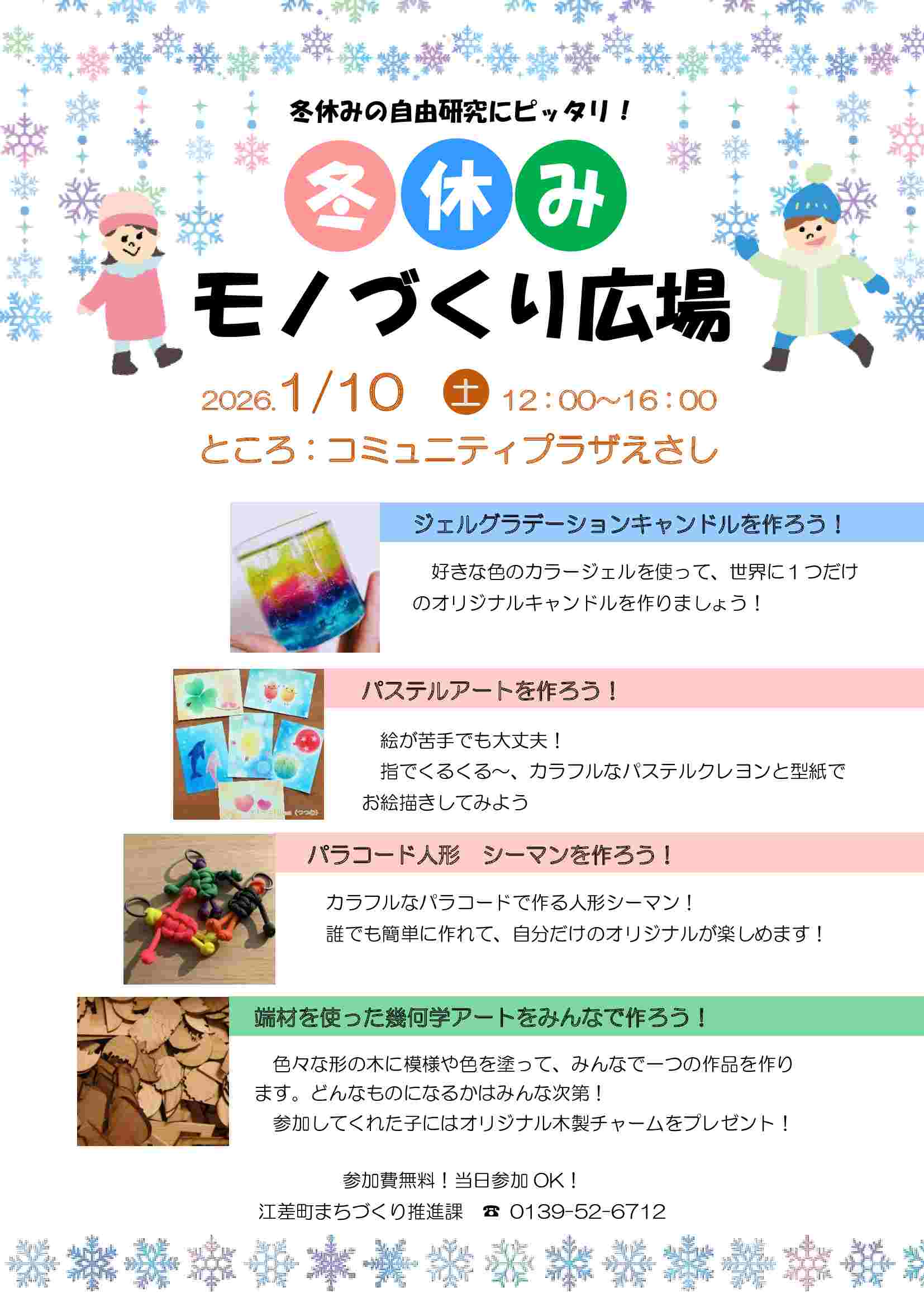 冬休みモノづくり広場 2026年01月07日更新 イベント概要 開催日 2026年1月10日(土曜日) 開催時間 12:00~16:00 開催場所 コミュニティプラザえさし(エコー) 参加費 無料 お問い合わせ 江差町まちづくり推進課 ℡0139-52-6712 アクセスマップ