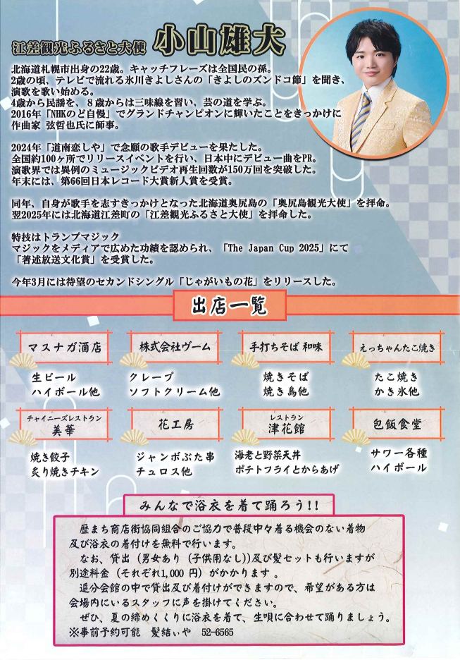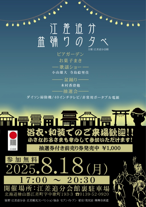 江差追分盆踊りの夕べ 2025年08月03日更新 8月18日(月) 『江差追分盆踊りの夕べ』を開催します。 歌謡ショーや盆踊り、抽選会もありますので是非お越しください! チラシダウンロードはこちらから 江差追分会館はこちらから アクセスマップ