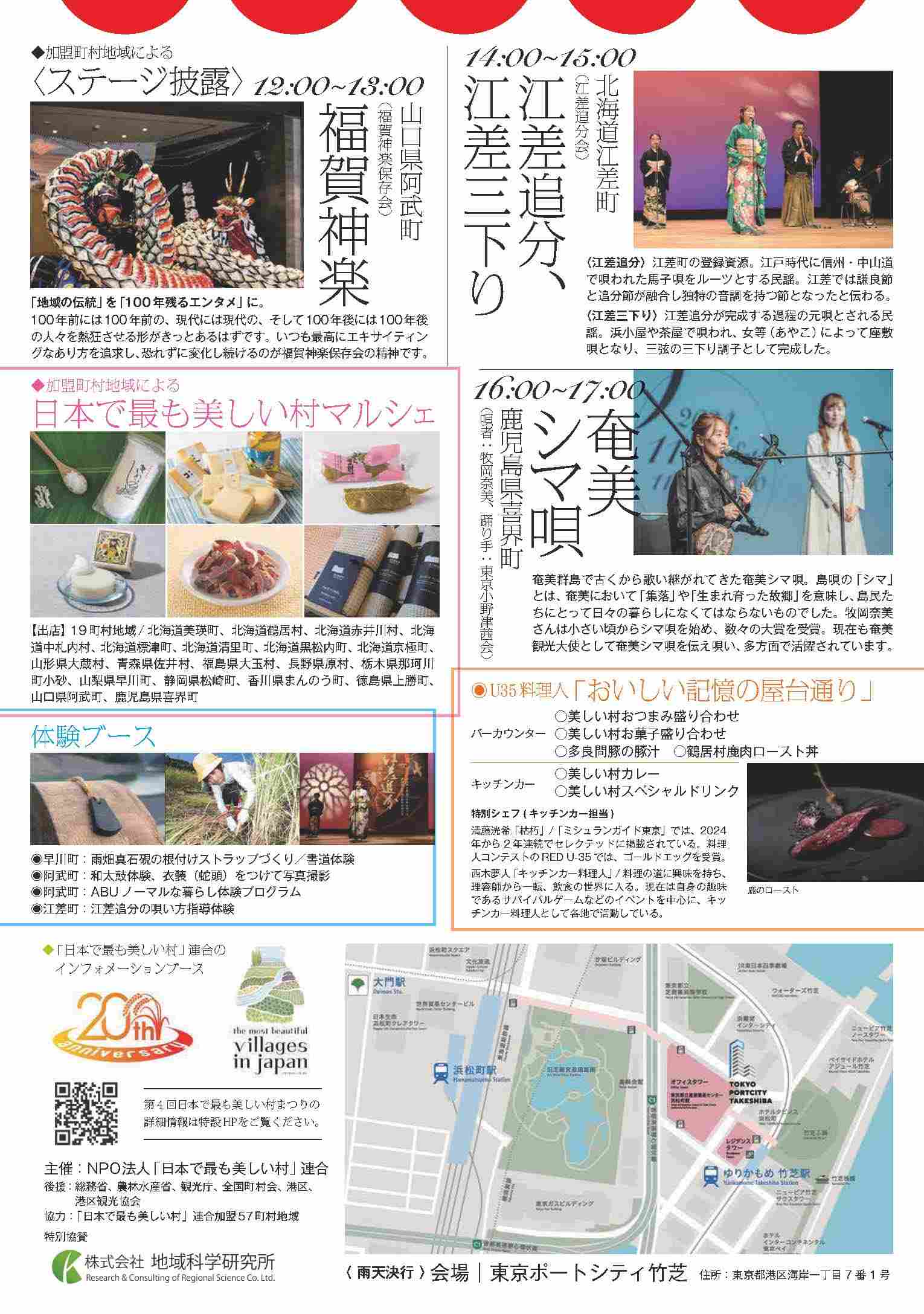日本各地から集まった「日本で最も美しい村」連合の町村が、魅力たっぷりのステージや特産品、体験、グルメをお届けします。
