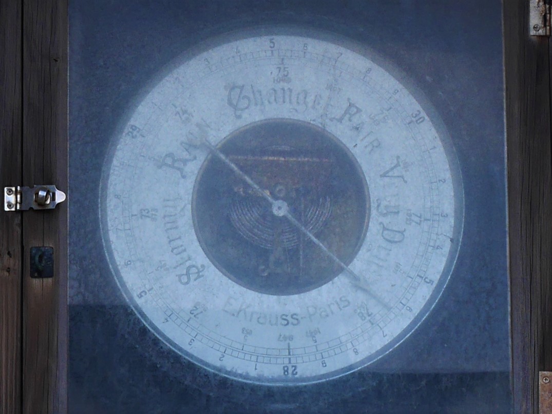 昭和3年に関川家が町に寄贈したアネロイド気圧計は直径30センチの盤面で、長針が、シケ、雨、ぐずつく、晴れ、カラカラ等を表す英語を指針する仕組みになっている。
