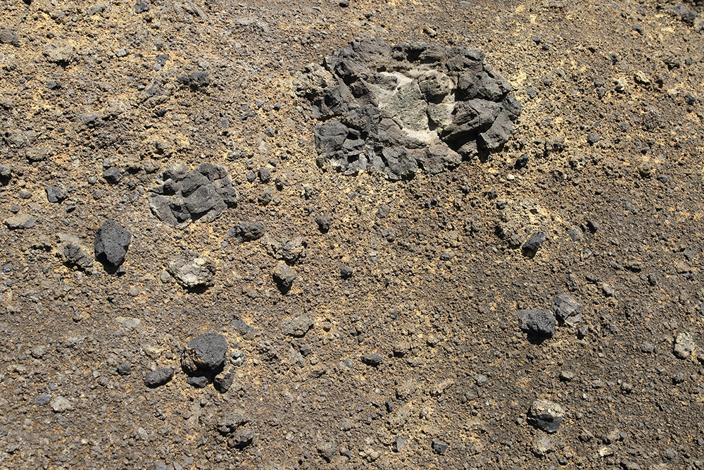 黄色い火山灰のなかに、火山から出た黒いかたまりがある。