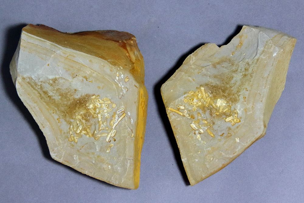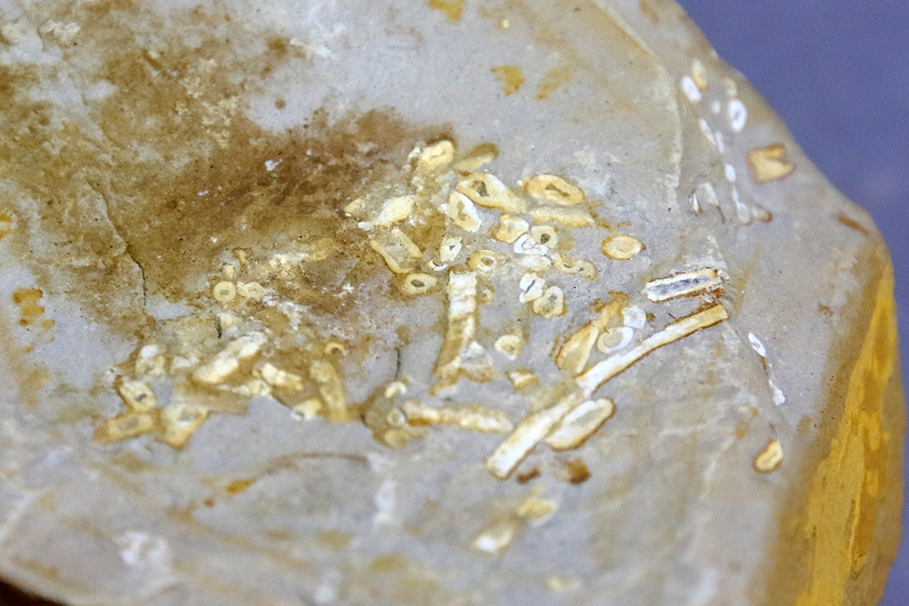 白いマカロニのような形をしているマキヤマチタニイという海の生き物の化石。
