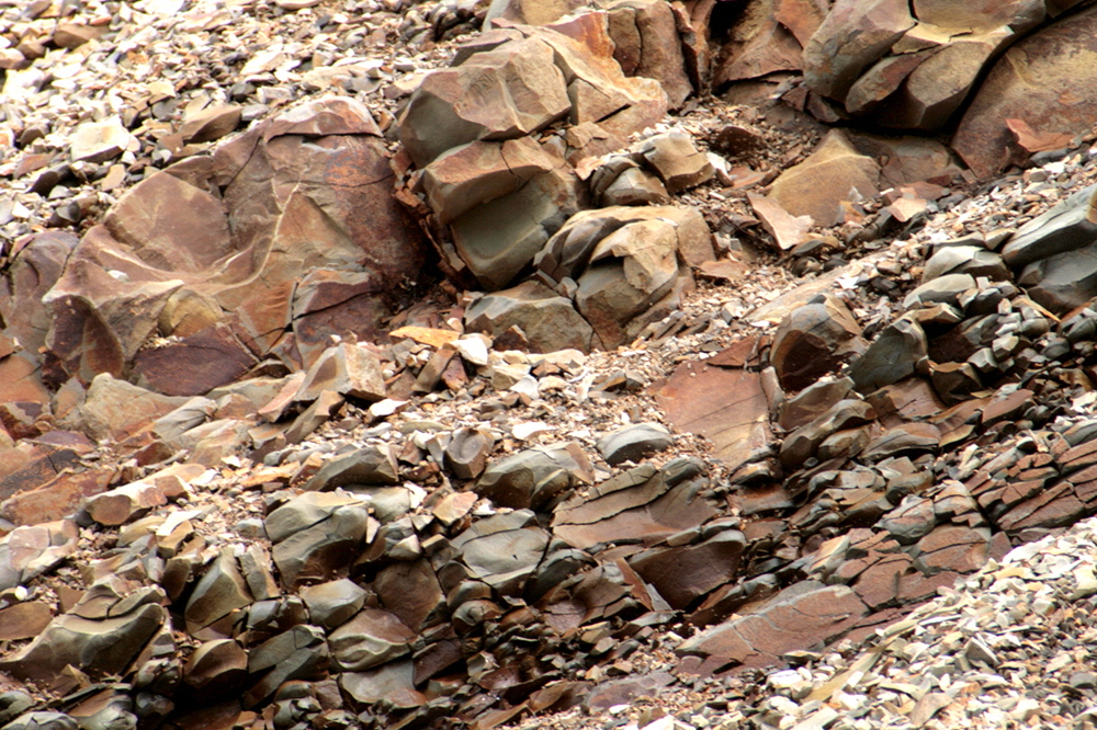 かたい岩だが、力を加えるとはがれるように割れる。