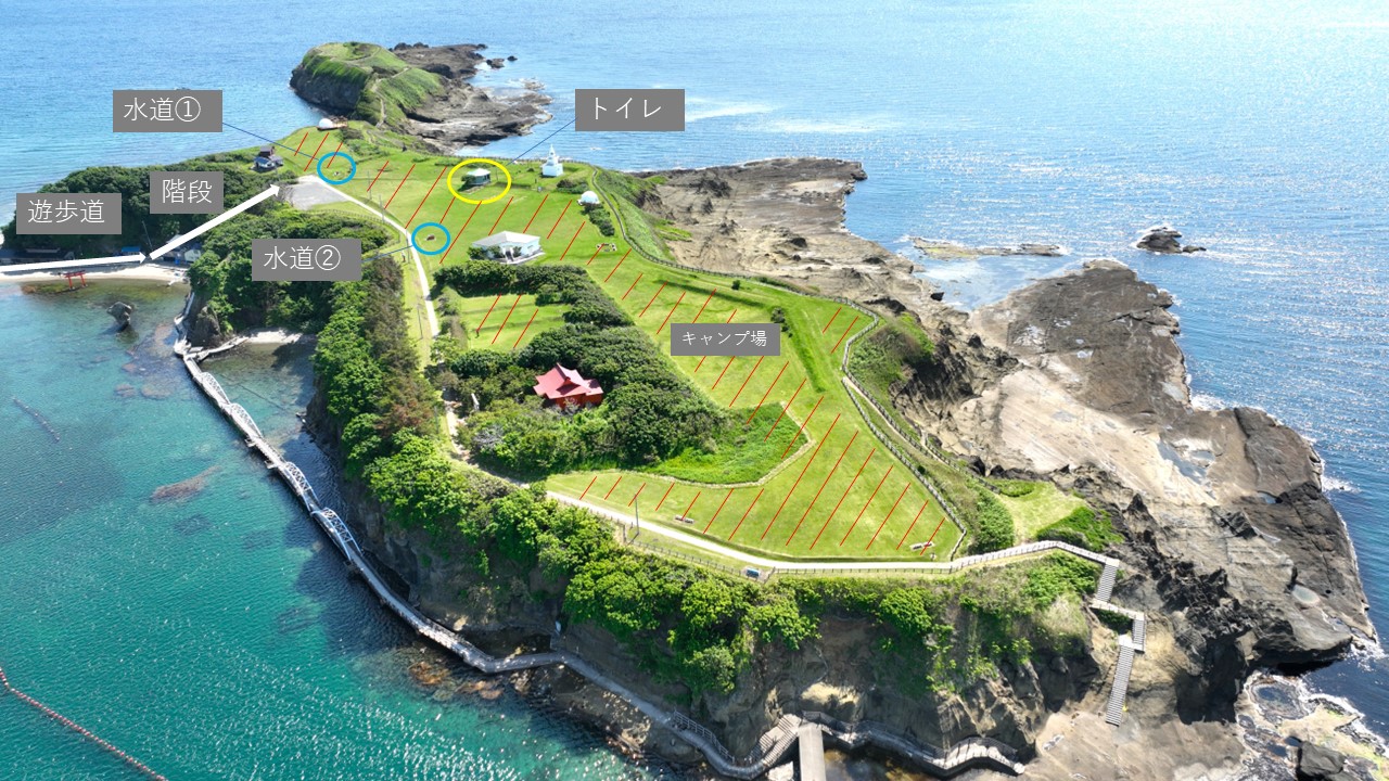 かもめ島キャンプ場は、周囲を海に囲まれた特別なロケーションが魅力。島の頂上に位置し、昼は青い海と空を眺めながらリラックス、夜は満天の星空の下で静かに過ごすことができます。