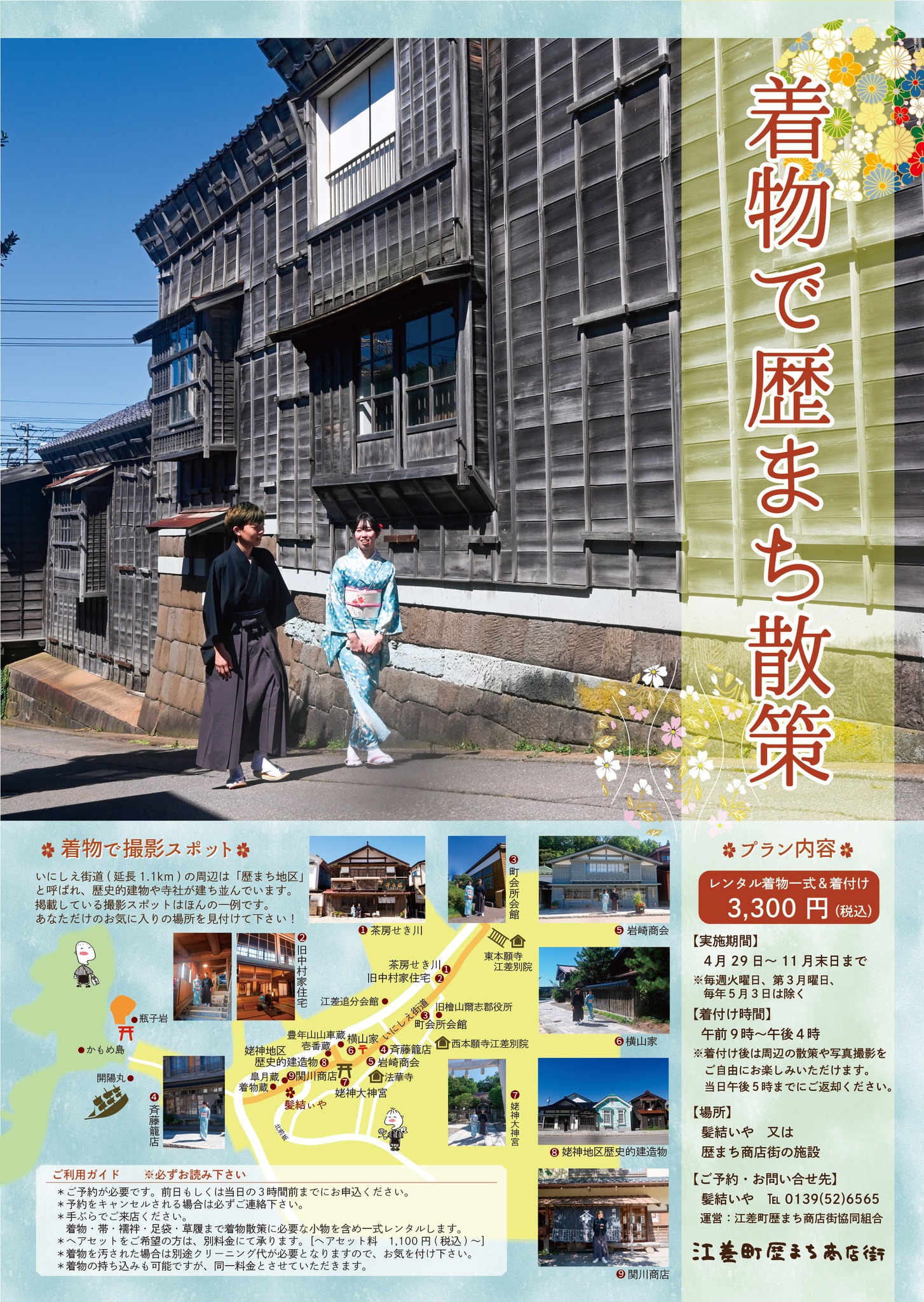 歴まち散策の際にご利用できる着物のレンタル一式と着付けがセットでなんと3,300円!!