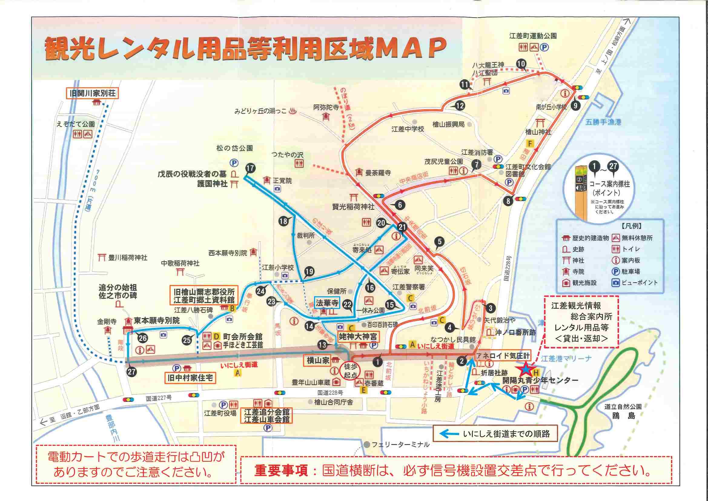| ①電動カート (一時休止中) | 1.自転車や乗用車の運転ができない、又は運転してはいけない方 2.下肢が不自由なため長時間の歩行が困難な方 3.中学生以上の方 4.身分証明書の提示及び複写 5.使用者最大体重(積載物含む)が100kg以下 |